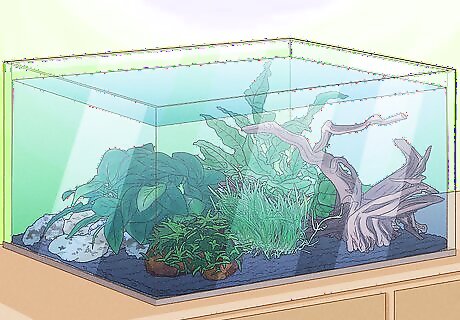 Select common, easy to grow freshwater plants. Freshwater plants have different lighting requirements and can sometimes be difficult to maintain. Luckily, there are some easy options for beginners that will create the look you want in your aquarium. Look for plants that are labeled as Echinoderms, Lilaeopsis, Anarchies, or Anubis. Good options for tall plants include Amazon Sword and Java Fern. Amazon Sword grows quickly and easily, providing great cover for your wiring and filter system if it’s visible from behind your tank. Java Fern has long leaves and provides good protection for fish. For medium-sized plants, great choices include Anubias Nana and Dwarf Sagittaria. Anubias Nana has curved stems with rounded leaves. Dwarf Sagittaria has long green leaves with curved blades and grows well around hard tank decorations like stone figurines.