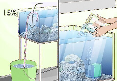 Clean your water weekly to maintain the health of your tank. Plants do not need water changes as frequently as fish do, but regular changes will keep your aquarium healthy. First, scrape any algae from the sides of your tank. Use a siphon to remove 10 to 15% of your water, paying special attention to the gravel and area around your aquarium fixtures. Replace the water you removed with fresh, dechlorinated water. When using your siphon, don’t use it in the plant bed or you could accidentally kill your plants. Instead, keep it above the substrate. Shrimp and catfish both feed on algae, so they could make a good addition to your tank, depending on the other fish you’ve chosen. This is also called changing your water. Some people like to clean the entire tank every few months, but this can upset your tank’s ecosystem. It’s better to use filters and maintain a clean tank.