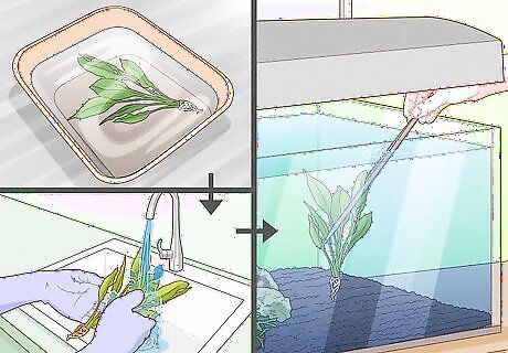 Quarantine and treat new plants before adding them to your tank. New plants may already harbor pests like snails or shrimp that can threaten the health of your aquarium. Snails and shrimp can breed quickly and fill your tank unless you have fish that feed on them. Additionally, they can introduce bacteria or diseases to the water. A quarantine will allow you to spot pests before they get in your tank. You can also treat your plants with a bleach solution. To treat with bleach, mix 1 part bleach into 19 parts water. Dip your plants for 2 to 3 minutes, depending on how sensitive your plants are. Thoroughly rinse the plants in fresh water before placing them in dechlorinated water. To prevent snail infestations, dip your plants into saltwater after purchase. Mix 1 cup (0.24 L) of aquarium or kosher salt into 1 gallon (3.8 L) of water. Dip the plants for 15-20 seconds, keeping the roots above water. Be sure to rinse them off with clean fresh water before placing them in the tank. After a week of quarantine, place them in the aquarium.