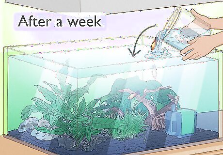 Add your fish after allowing a week for your tank to stabilize. Wait a week after establishing your plant garden before adding the fish. If you already own fish, you can leave them in a temporary aquarium. Otherwise, it’s best to wait until your tank is ready before acquiring your fish. Waste excreted by the fish will help feed your plants. Resist the urge to add your fish early. Your tank needs to go through a process called “cycling,” where the water conditions stabilize and become safe for fish. Very few fish can survive before the water conditions have stabilized.