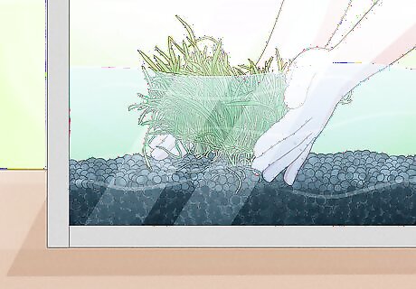 Anchor the plants that need to be on the substrate so they get nutrients. Some plants need to be rooted in the substrate in order to absorb needed nutrients. Place the roots of these plants just under the substrate, but don't bury them deep because this can cover the rhizome of the plant, which is a thick green part above the roots. Covering the rhizome can cause the entire plant to die. Make sure that you do not anchor one plant on top of another.