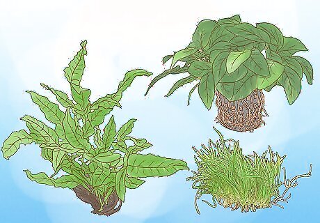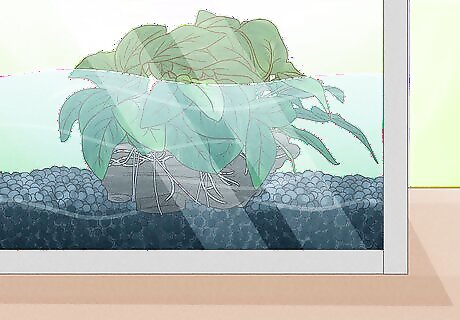 Tie the remaining plants to rocks or wood so that they can root. Some plants, like moss, Java Fern, or Anubias Nana prefer to root into rock or wood. The plants will then take root on the rock or wood. Wrap fishing line gently around the plant, then loop the line around the rock or wood. Tie the fishing line in place, then add the rock and plant to your tank. Driftwood and lava rock are great options for tying down plants.
