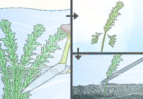 Grow your plants from cuttings if you want a less expensive option. While it will take longer for your final look to develop, cuttings are more economical. To grow them, you will need to acquire cuttings from an existing plant, which are sold through most aquarium stores and online. Locate the lowest stem node on your cutting, then remove the leaves below it. Plant the stem in the substrate so that it will take root. You may also be able to acquire a cutting from someone you know who owns an aquarium.