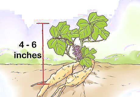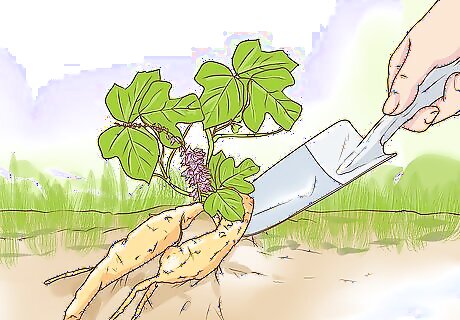 Dig up the roots. Kudzu roots range widely in size and depth. Surface roots are about 1.5 inches (3.8 cm) in diameter and only go a few feet deep. Mature roots can weigh over 200 pounds and be over eight feet deep. To access the smaller roots, use a hand and push shovel. Carefully remove the dirt around the root before severing it and pulling it out. Roots taste the best when harvested in the fall. Older roots are tougher in texture.