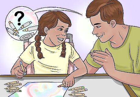 Provide tools and adaptive materials. Depending on the child's specific disability and motor-skills development, the child may need special tools so they can participate in an activity designed for able-bodied children. For example, if the child has difficulty gripping things, you might want to put tape around crayons and markers so they are easier for the child to grasp and hold. Even if the child has limited motor skills, you still want to make sure the things you provide for the child are age appropriate. For example, a child who has difficulty gripping crayons or markers shouldn't be given baby crayons. Rather, you adapt the regular crayons so that child can use them. You might want to install edges on tables where the child is working or playing, or use a lid or a cookie sheet to keep loose items contained so they don't get scattered out of the child's reach. If you're unsure how to adapt a particular activity, ask the child. Older children typically are able to help you brainstorm ideas that would enable them to participate.