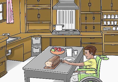 Include wheelchair-friendly features in your kitchen. Even though young children probably won't be cooking, you can include modifications in the kitchen that enable the child to get their own snacks and participate in creating family meals. Providing adjustable counters that can pull out for the child, or creating at least one wheelchair-height counter, will allow the child to participate in food preparation and other kitchen activities. This helps the child be more independent by enabling you to teach them how to prepare and cook healthy meals. Arrange the kitchen so there is enough room for the child to turn around and freely navigate the space, even when appliances are open. You may need to lower cabinet handles or drawers so the child can more easily reach them.