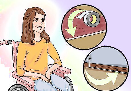 Remove or tape down rugs and wires. A child in a wheelchair should be able to move around their home independently. Make sure pathways are clear, and there's nothing that the child could trip over or that could impede the wheelchair. In most cases, you should avoid area rugs. While an adult in a wheelchair may be capable of rolling over the edge of a rug, a child may not have the strength or control necessary to do this. Install hard flooring or use low-pile carpeting so the chair can move smoothly from room to room. Secure wires along the baseboards and run them around the wall, rather than leaving them across the floor.