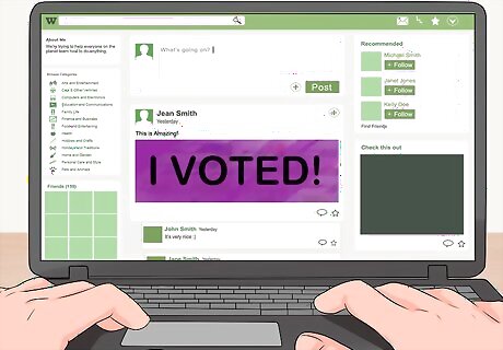 Inform a large audience through social media. Social media has become a major tool used to express political thoughts and opinions. It’s also used to inform people of current political events. Use this platform to reach all of your friends, family members, and acquaintances. Post educational articles and your personal thoughts on sites like Facebook and Twitter. You can also post pictures of your “I Voted” sticker after voting to encourage others to hit the polls. Make sure to be kind and respectful in how you share political viewpoints on social media sites, or else others may not read your posts or take them seriously.