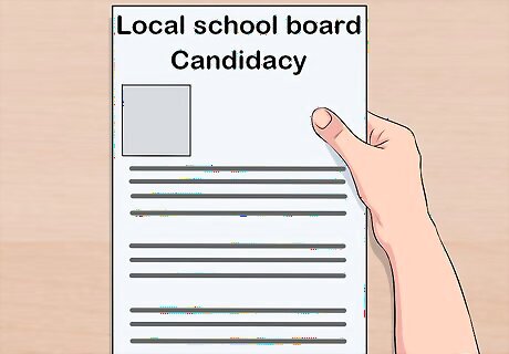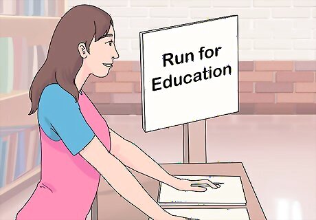 Run to be on your local school board. School board duties vary depending on where you live, but most of them are made up of a group of elected unpaid volunteers who are governed by bylaws. The board makes decisions about funding, school calendars, and many other things. To run, reach out to your town, city, or county clerk to find out if you’re eligible. If you are eligible, the clerk should give you all of the paperwork you’ll need to complete and submit in order to run. Keep in mind that while being on the school board can give you influence and power, it can also be demanding and time-consuming. Be ready to spend at least 25 hours a month on school board activity if you’re elected.
