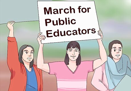 Participate in rallies and other events. There are often rallies and marches that are planned in order to display support for reform on a large scale. Look into education-related political rallies in your area and take part in them. Additionally, if an important political leader makes a decision that doesn’t benefit the education system, you can participate in peaceful protest. The March for Public Education occurs annually in Washington, D.C. and in cities all across the United States. For example, if the president makes budget cuts in schools across the nation, people may come together to protest against this decision.