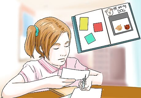 Ask them to create a memorial. Creative activities can help your child process emotions, and a pet memorial will give them something concrete to remember their dog by. There are many different types of memorials that your child can create for their dog. These include: A scrapbook of all of their memories with their dog A drawing of their dog that you can hang on their wall A letter to their dog A plaster paw print or bone with the dog’s name A shadowbox filled with the dog’s pictures, toys, or collar A story about the dog as written by the child