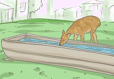 Leave out water for animals who are fleeing the bushfires. Wild animals whose habitats are on fire are trying to escape to safety. Often, they are thirsty, dehydrated, and injured. Help them by placing containers of fresh water outside your home so they can take a drink or bath. Replace the water once or twice a day so it's fresh and full. Check for wildlife around the water container before you approach it, just to be safe. You don’t want to surprise an injured animal that might become aggressive.Tip: Keep your pets indoors for the duration of the wildfires so they don’t come into contact with wild animals who are fleeing. Startled pets may bite or scratch injured wildlife, which can worsen their injuries.