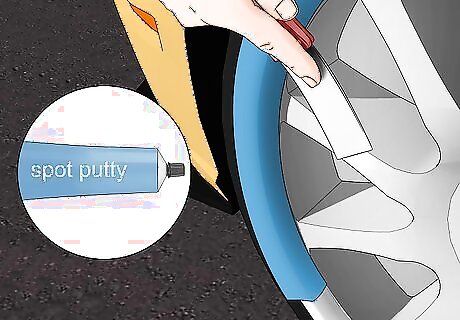 Apply spot putty over the scratch with a putty knife. Spot putty is a 1-part putty designed to fill imperfections and scratches. Use a putty knife to scoop out a small amount of the spot putty from the container. Scrape the putty knife over the scratch to apply the putty, fill the scratch, and create an even and uniform layer that is flush with the rim. You can find spot putty at hardware stores, home improvement stores, and by ordering it online. You can use your finger to apply the spot putty, but make sure the surface is smooth and consistent.Alternative: If you don’t have spot putty, you can use plumber’s putty instead.