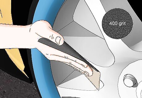 Switch to 400-grit sandpaper to sand over the putty so it’s smooth. Once you’ve sanded the putty down so it’s consistent and even with the rim, take a fine-grit sandpaper and use circular motions to sand the putty and the rim around it so they’re smooth. Polishing the putty will remove any scratches in the putty and on the rim so they’re nice and smooth. Polishing the putty with fine-grit sandpaper also helps the primer and paint adhere evenly.