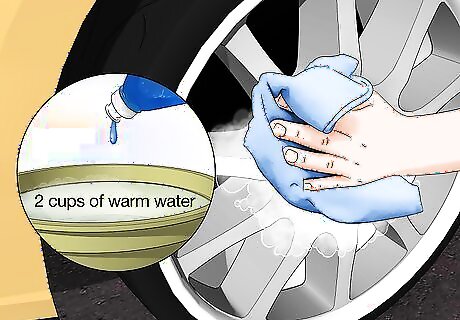 Scrub the rim with soap and water to remove dirt and grease. Fill a bucket or container with about 2 cups (470 mL) of warm water and add a few drops of a mild dish soap. Mix the solution together so it’s nice and soapy. Soak a clean cloth in the solution and wash the scratched area of the rim to remove dirt, debris, and grease from the surface. You can also fill a spray bottle with the cleaning solution and apply it directly to the rim. Warm water will dissolve dirt better than cold or room temperature water.