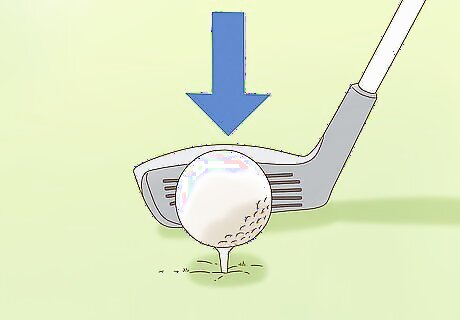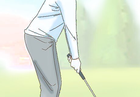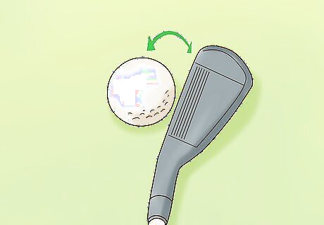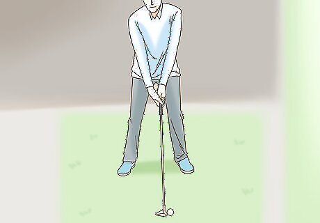 Position yourself so the ball is halfway between your sternum and your front heel. Start with the ball lined up with your sternum, and make sure your feet are shoulder-width apart. Take a small step in the direction opposite of where you want to hit the ball. Your front foot should be about the same distance from the ball as your sternum. If you golf right-handed, take a small step to the right. If you play left-handed, step to the left. Standing so the ball is slightly in front of your stance ensures that you hit the ball so it gets more airborne.