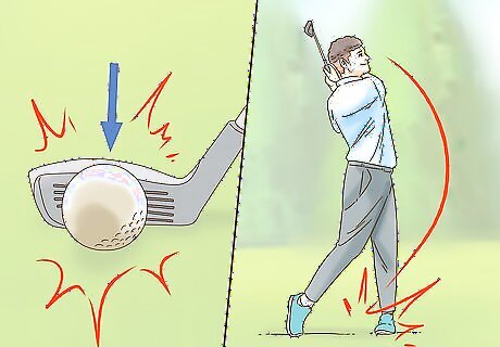 Hit the ball with the center of your clubface. Twist your hips forward as you start bringing the club back down. Bring your club down at a steep angle to avoid hitting the grass and affecting the angle of your clubface. Continue your swing as you hit the ball to get it out of the rough. Be sure to follow through with your swing to get the most power.