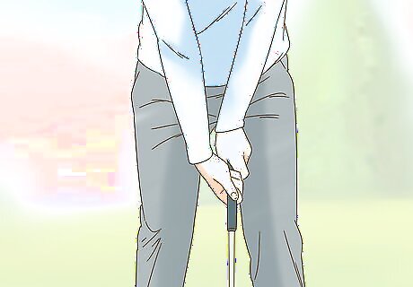 Hold the club so the end is 3–4 in (7.6–10.2 cm) in front of your hips. Stand with your feet at shoulder-width and your knees slightly bent. Hold your golf club so your dominant hand is below your non-dominant hand, and set the clubface directly behind the ball. Keep your arms fully extended down so your hands and the end of the club are in front of your thighs. Let your arms hang freely in front of you and bring your hands together without reaching further out to find where the end of the gold club should be when you hold it. Roughly, it should be about 3–4 in (7.6–10.2 cm) in front of your hips.Tip: Check your aim by laying your club horizontally on the ground so it’s touching your toes on both feet. The end of your club will point in the direction you’re aiming. Adjust your feet until you’re aiming where you want.