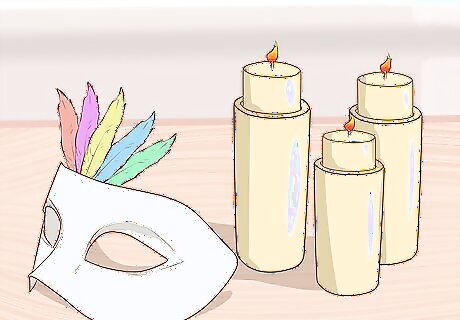 Decorate accordingly. The decorations make the party. Include little masquerade details everywhere – like candlesticks in elegant candleholders (used safely, of course), glitter on some of the tables, masks as centerpieces, etc. You could also hang some masks on the wall. Consider draping dangly lights from the ceiling and using colorful fabric to cover up any out-of-place furniture.