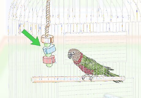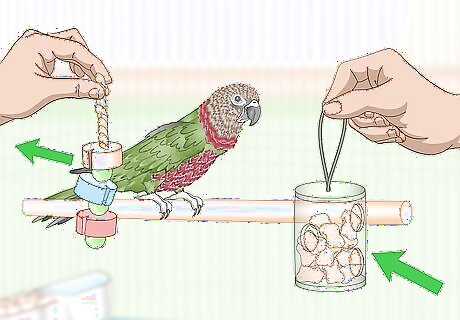 Rotate the toys. Hawk-head parrots can get really bored if they play with the same toys all the time. To help with this, rotate the toys inside the cage every one to two weeks. Place new puzzle toys and differently shaped toys inside the cage. Move the perches, swings, and ladders around to stimulate your parrot. Make sure the parrot has a couple of toys in their cage at one time. Clean and store the toys you’ve rotated out until you place them back in the cage.