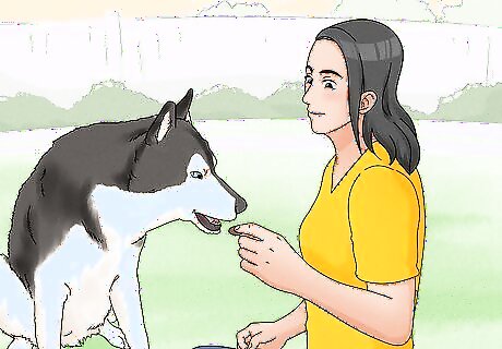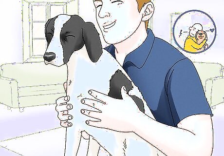 Use treats to link hugs with positive associations. Once you've worked up to a hug with gradual closeness and intermediary levels of contact, you can begin hugging your dog. Just be sure to do so with positive reinforcement: give your dog a brief hug, then reward it with a treat. Repeat often over time and make the hugs longer the more tolerant your dog becomes. Many widely available dog treats are the equivalent of human junk food, so look for small, organic varieties, or use tiny bits of chicken or turkey.
