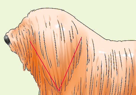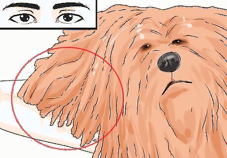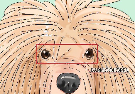 Examine its eyes. The Puli's eyes are almost never seen since the amount of hair will cover it. The almond-shaped eyes are deep-set in the Puli's head. The eyes themselves will always be dark colored. You can trim the hair on the Puli's face to make the eyes more visible.