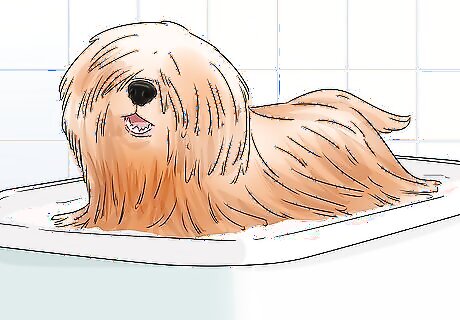 Bathe a Puli. Puli adults should be bathed very infrequently. In fact, you may only want to bathe them regularly if you are showing them professionally in dog shows – otherwise, four or five times per year will suffice. But if you must bathe your Puli, be sure to wet it down with water first. Then apply some gentle dog shampoo to the tendrils and rinse them out. Make sure you use plenty of water and rinse thoroughly. It is also a good idea to dilute the dog shampoo before using to protect your Puli's sensitive skin. Pulik, in general, should not be bathed very often because their dense coat takes so often to dry and this can lead to skin irritations and dermatitis. Before 8-10 months, though, you can feel free to bathe your Puli puppy as needed – about once every three weeks or so.