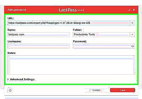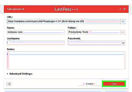 Enter the website information that you want to save a password for. You will need the website URL, password, and username. Click Advanced Settings and select Autologin if you want LastPass to log you in automatically for that website.