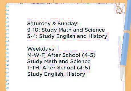 Set aside time in each day to study. High school can be demanding; there are plenty of personal obligations and relationships, and many students have part-time jobs in addition to the difficulties of school coursework and homework itself. To improve your performance in your courses, don’t mix your studying time with social time. Set aside however much time you need each day (start with 3 or 4 hours) and spend that block of time focused only on your schoolwork—no video games, TV, etc.