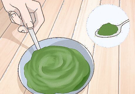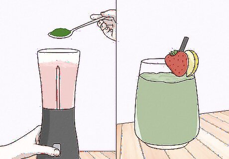 Add spirulina to smoothies for a more earthy flavor. This is a popular choice for health enthusiasts because you can combine lots of healthy ingredients along with the spirulina. It also masks the powder’s flavor better than juice. Add 1 or 2 spoonfuls to your favorite smoothie and blend the mixture together. Sweet flavors can offset the earthy tone of spirulina, so try using sweeter fruits in your smoothie like pineapples, mangoes, and oranges.
