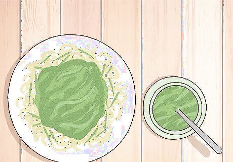 Make pesto sauce with spirulina. Pesto sauce pairs perfectly with spirulina because it already has an earthy, nutty flavor. Sprinkle some in to complement the taste. Do a flavor test to find the right amount, then pour the sauce over fresh pasta. Pesto is also a great sauce for dipping bread or using on vegetarian pizzas. You could also use spirulina in other earthy pasta sauces, like ones with mushrooms or truffles.