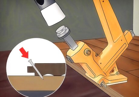 Begin laying rows with the flooring nailer. Once you have enough space, you should begin using the flooring nailer (though you could technically do the entire floor with the hammer and nails). Simply align it with the board to be nailed and then hit it.