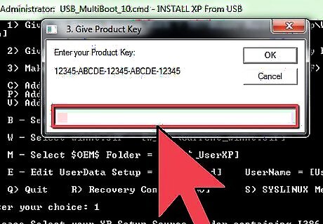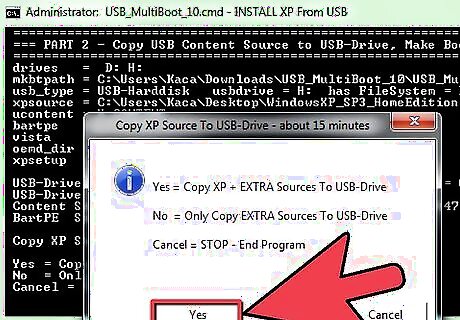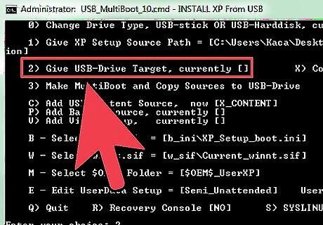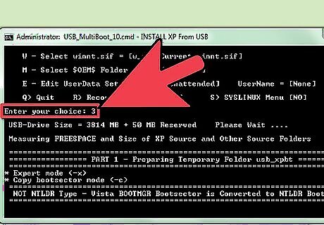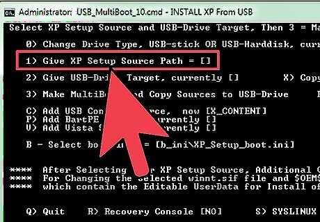 On the command screen, change your drive type and give XP setup a source path. First, type 0 and press Enter so that USB Stick appears at the end of the line. Then, type 1 and press Enter and to select the Microsoft Windows XP path. (Browse to the CD drive or the path on the HDD where you have your XP installation files). If you receive a message about "winnt.sif," hit Yes.