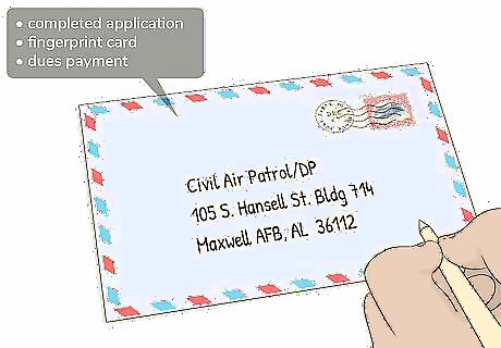 Submit your application, fingerprint card, and dues by mail. The application for senior members must be submitted through the mail. Include payment details for your credit card if you want to pay by card or send a check along with the application. The address to mail your application form to is listed at the bottom of the page here: https://www.gocivilairpatrol.com/join/active-adult-in-cap/active-adult. Annual membership costs are different in each state. Check how much it costs in your state here: https://www.gocivilairpatrol.com/join/membership-dues.