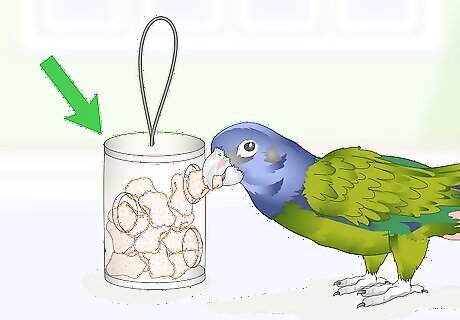 Buy foraging toys. Birds have a natural drive to hunt for their food in the wild, so provide toys that make them work for treats. Visit a pet supply store and look for medium-sized bird toys with compartments you stick treats into, and then let your parrot work through these puzzles once a day. Make your own foraging toy by sticking seeds into an envelope or coffee filter and twisting it closed. Hang it from a string inside the cage and let your bird try to open it to get to the treat inside.