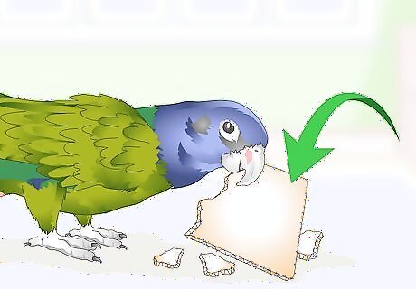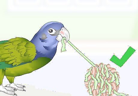 Select shredding toys. Redirect some of your parrot’s boredom by giving them toys they can shred. Look for toys with corrugated cardboard or paper finger traps. Or buy a cross section of coconut, which will satisfy your parrot’s need to shred and chew. If you have tissue paper at home you can weave it through the bars of the cage and let your parrot enjoy shredding it apart.