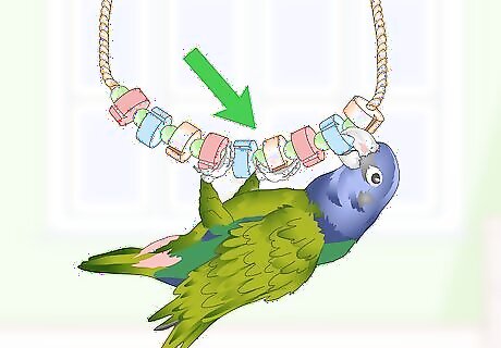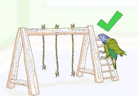 Buy exercise toys. Your parrot needs to move around and exercise in their cage, so buy ladders or swings for them to perch on and climb. Search for perches with strings and wooden beads, then hang them from the top of the cage to allow your bird to move around in a variety of ways.
