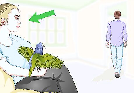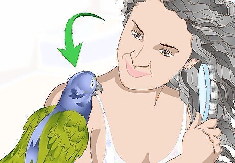 Establish a routine. Parrots like routine, so let them be part of your daily schedule. Let them come into the bathroom in the morning while you brush your hair, or bring them into the kitchen while you make coffee. Try to do these things at the same time every day so that your parrot can expect them. Never allow your parrot to be in the kitchen while the stove is on. They could land on a hot burner and injure themselves.