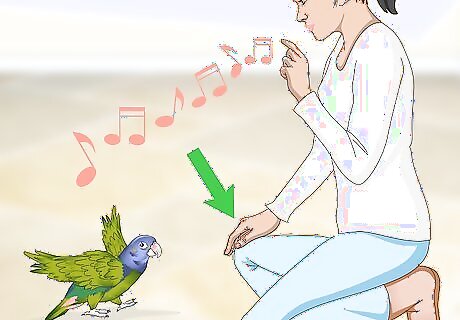 Sing and dance with your parrot. Sing your favorite song to your parrot, or sing one that has special dance moves that go with it. Repeat this at least once a day so that they learn the repetition. You may even get your parrot to start repeating some of the moves. For example, while singing “Head, shoulders, knees, and toes,” touch each of those parts of your body to teach your bird what they are.