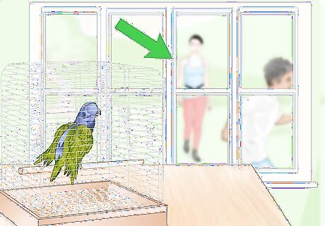 Place their cage near a window that doesn't get direct sunlight. Arrange your parrot’s cage so that they can watch a busy street or sidewalk during the day. Or put them by a rear window and then put out bird feed in the back yard to attract wild birds for your parrot to watch. Know your parrot’s personality. If other birds stress them out too much, keep their cage far enough from a window that they’re unlikely to see any.
