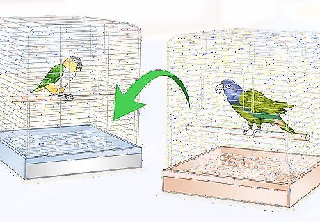 Put two bird cages near each other. If you happen to have two parrots, put their cages near each other while you’re out. Don’t place them close enough that one could reach forward and bite the other, just put them close enough that they can stick their feet through and play footsie if they want to.