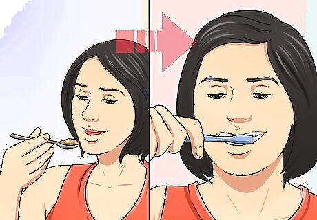 Avoid foods high in sugar and artificial flavors or colors. Though it may be tempting to maintain a diet of soft treats, like ice cream, pudding, jello, and hot chocolate, avoid overindulging on sweets. Too much sugar can lead to the development of dental issues like plaque-building cavities, which can lead to white spots when your braces come off. Cut down on known cavity causers in your diet and try to only eat treats or sweets occasionally. Always brush your teeth well after eating foods high in sugar and artificial flavors or colors so these products do not remain on your teeth for a long period of time. Rinse with mouthwash or dilute half of a spoon of baking soda in a glass of water and then rinse properly to eliminate any bacteria and to protect your enamel.