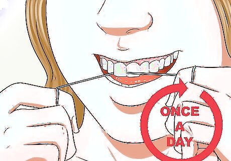 Floss at least once a day with a floss threader. Another key element of good dental hygiene is flossing at least once a day. It can be tricky to floss when you have braces, as you should floss between your braces and under the wires of your braces. Make flossing easier by using a floss threader or an orthodontic flosser. You can buy these products at your local drug store or ask your orthodontist for a sample. Use waxed floss, rather than unwaxed floss, as it is easier to slide between your teeth and less likely to snag on your braces. The floss threader works by allowing you to attach the floss to a threader, making it easier to slide the floss under your braces and reach your teeth. This also makes it easier to handle. Always floss well along and under your gum lines. It may take practice to master flossing with braces, but be patient and take your time. If you have spaces between your teeth, use the interproximal brush to go between these spaces when flossing.