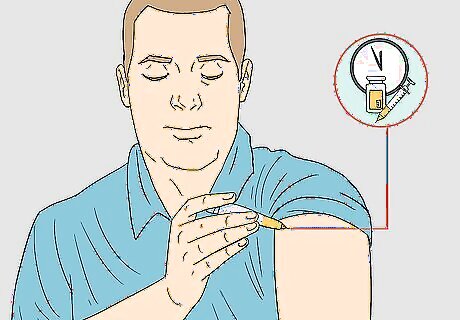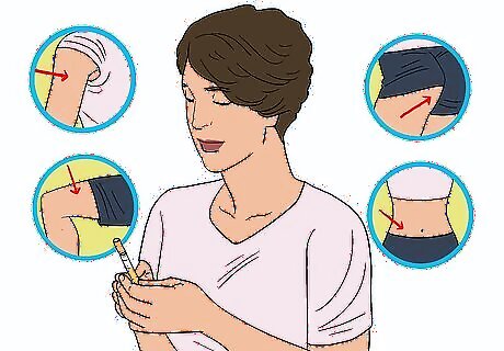 Inject your insulin in the same general area each time. Insulin must be injected into the fat under your skin. This ensures that it will get into your bloodstream. Good locations to use for insulin injections include your buttocks, abdomen, back of your arm, and thigh. The insulin will take effect more quickly or more slowly depending on where you inject it, so it’s important to inject into the same general area each time. Don’t inject into the same exact place every time, but use the same general location for injections. Rotate your injection sites around the same area to avoid hard, fatty deposits. For example, if you deliver your injections into the right side of your abdomen for one dose, inject into the left side the next time.
