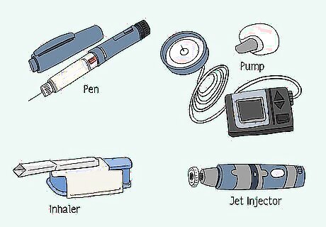 Ask your doctor about devices that make taking insulin easier. The most common way of injecting insulin is with a syringe. However, it can be time-consuming and inconvenient to draw up the medication every time you need it. Ask your doctor about alternatives to syringe injections, such as: Insulin pen. This is a pre-filled device that you can use to dial your desired dose and inject yourself without measuring and mixing your insulin. Using a pen can help you reduce dosing errors. Insulin pump. A small device that delivers a steady stream of insulin 24 hours per day. The insulin is delivered via a small needle that stays put in your skin. You will need to change out the needle about once every week. Insulin pumps mimic the timing of your natural insulin release and can also help you avoid dosing errors. However, they are expensive and require frequent monitoring of your blood glucose levels. Jet injector. This device injects insulin without a needle by using pressure. The insulin is compressed and when you “inject” it, the high-pressure spray allows the insulin to cross your skin and enter your bloodstream. Injectors are also less painful than syringes. Inhaler. This is similar to an asthma inhaler, but it delivers powdered insulin to your lungs, which then gets into your bloodstream.