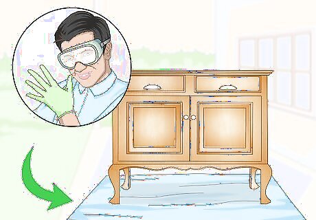 Cover the floor and protect your eyes and hands. Lay down newspaper or a drop cloth on the floor underneath the oak piece you will be working on. Put on protective googles to protect your eyes from the potent chemicals in the furniture stripper. You should also put on gloves to protect your hands. If possible, apply the chemical stripper outdoors for proper ventilation. If you do it indoors, open as many doors and windows as possible.