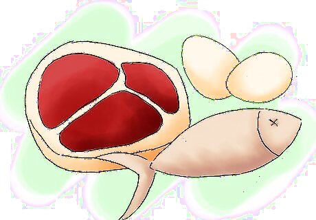 Incorporate good foods into your diet. Good foods you may want to consider adding or substituting into your diet are as follow: Good protein sources include skinless chicken breast, ground turkey, bison, egg whites, Greek yogurt, and tofu. Good fat sources include almonds, peanuts, flax seeds, chia seeds, fish, egg yolks, and olive oil. Good carbohydrate sources include unprocessed carbohydrates such as sweet potatoes, brown rice, fruit, oatmeal, bran, wheat germ, Bulgarian wheat, beans, and vegetables.