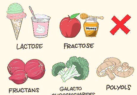 Try adopting a FODMAP diet to reduce IBS symptoms. FODMAPs stands for fermentable oligosaccharides, disaccharides, monosaccharides, and polyols. These are all short-chain carbohydrates that you can get from certain foods and they tend to cause IBS symptoms to flare up. By avoiding these foods, you may be able to reduce your IBS symptoms. Avoid or limit foods that contain: Lactose, such as cow’s milk, ricotta cheese, mascarpone, ice cream, and yogurt Fructose, such as cherries, peaches, apples, pears, honey, and high-fructose corn syrup Fructans, such as garlic, onions, Brussels sprouts, asparagus, wheat, rye, and inulin Galacto-oligosaccharides, such as chickpeas, kidney beans, soy, and broccoli Polyols, such as apricots, watermelon, blackberries, nectarines, cauliflower, mushrooms, snow peas, and sugar-free sweeteners, such as sorbitol, mannitol, and xylitol Consider using this graphic to help remember what’s ok to eat: https://blogs.bcm.edu/wp-content/uploads/2015/03/fodmaps.png