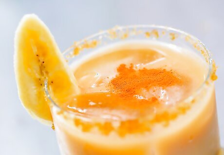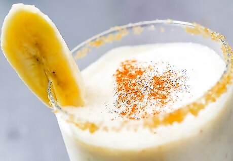 Garnish the drink. Add a banana slice on the side of the glass and sprinkle a dash of cinnamon on top.