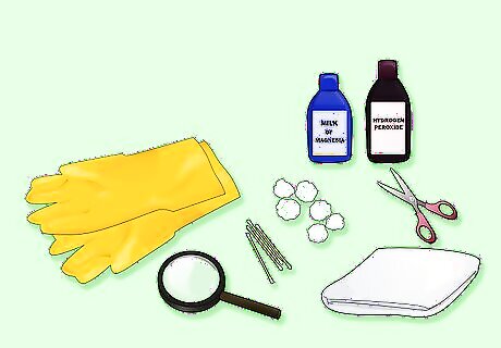 Assemble your basic tools and supplies. You’ll need to gather an array of supplies for the first aid kit. Start with basic items that you can use in any medical emergency. You should have supplies for treating and disinfecting wounds. Get items like antiseptic wipes or ointment and rubbing alcohol, and also protective gloves. Cotton balls and swabs may come in handy, as well, for wiping clean wounds or applying substances like alcohol. A magnifying glass, a pair of scissors, tongue depressor, penlight, and tweezers are useful to help you see and treat some kinds of injuries. For insect bites, consider including sting stop pads or even an old credit card to scrape away imbedded stingers. You will also want to be ready for poisoning, with items like milk of magnesia to absorb poison and hydrogen peroxide to induce vomiting. Always talk to a vet or poison control center before treating poison. Have a muzzle, a towel or pillowcase for restraint, a leash, rectal thermometer, and an oral syringe, as well.
